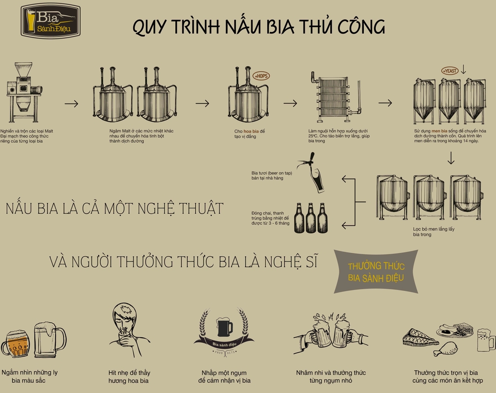 Bia thủ công (craft beer) tại nhà hàng Bia Sành Điệu được cập nhật thường xuyên, mỗi lần đến quý khách sẽ được thử những vị bia khác nhau, điều đó làm nên một trải nghiệm khác biệt mà những nhà hàng bia thủ công thông thường sẽ không bao giờ có đươc.